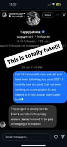 Entre idas e vindas nas discussões, houve quem usasse o design para alimentar inteligência artificial na intenção de analisar uma possível conexão da ilustração com ACOTAR, e um print de uma conversa que teria acontecido entre um fã e um dos artistas também veio a tona. Nele eles “confirmariam” que seu story realmente se tratava de um projeto envolvendo o novo livro. E isso é MENTIRA!! O perfil Patch Monnier compartilhou dois stories esclarecendo que o print é falso e pediu encarecidamente por respeito.