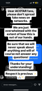 Tradução: “Caros fãs de ACOTAR, por favor, não espalhem notícias falsas nas redes. Estamos simplesmente sobrecarregados com a extensão de como isso está fora do nosso controle. Tenham certeza de que nunca falaremos sobre nada, e claro, não responderemos nenhuma pergunta!
