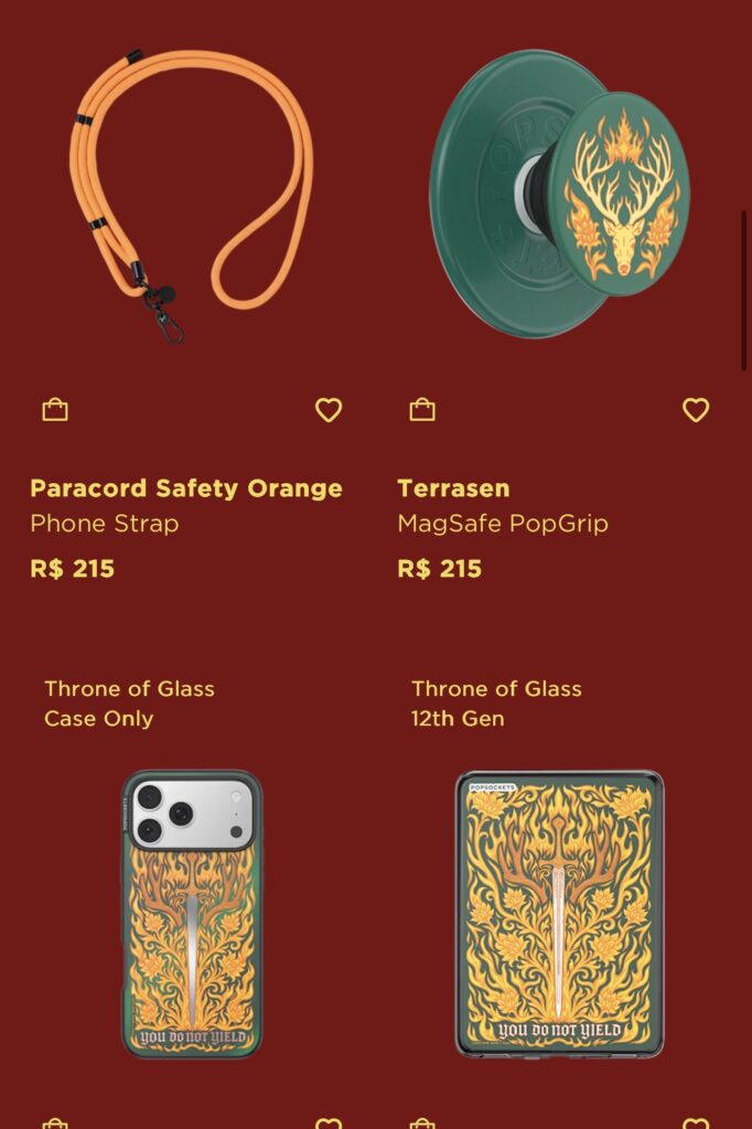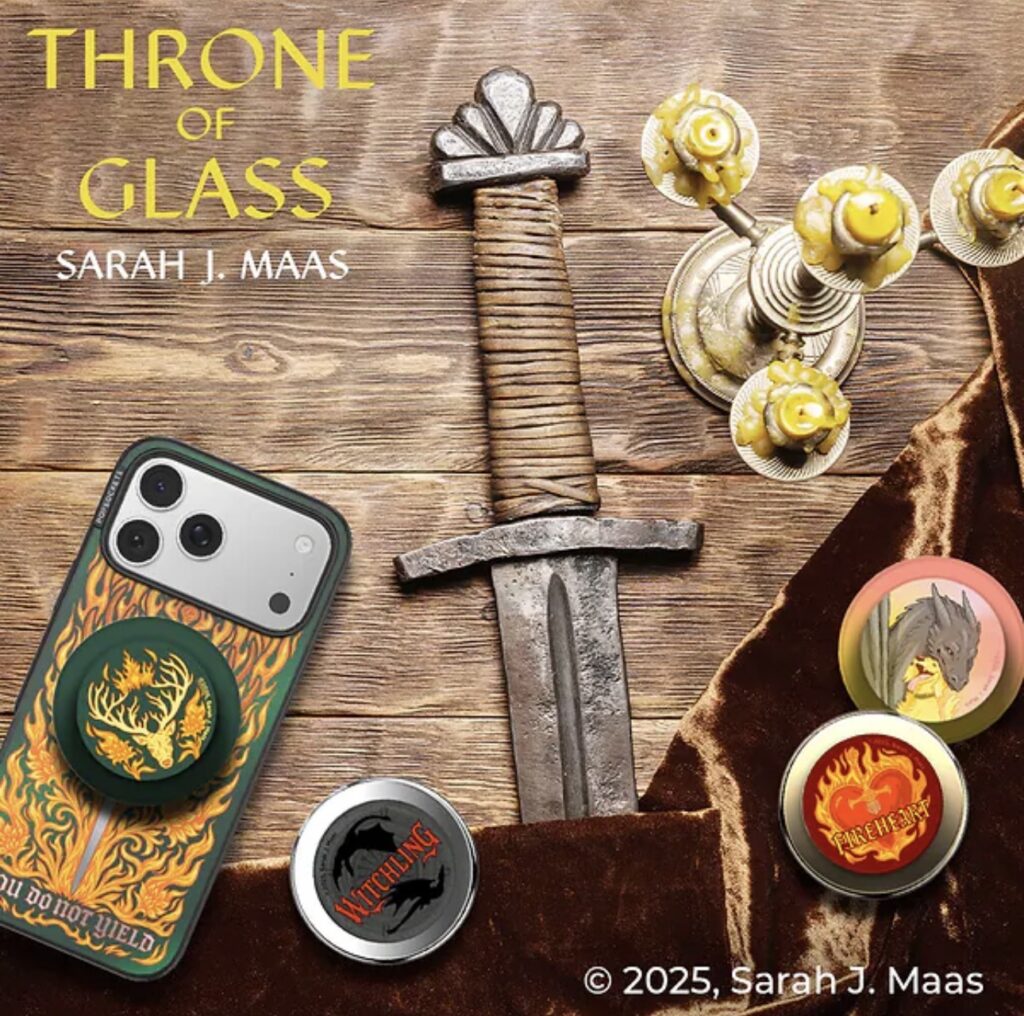 O perfil SJMaasUpdates no Instagram anunciou que Sarah J Maas, em colaboração com a loja PopSockets acabou de lançar uma coleção de produtos temáticos de Trono de Vidro.